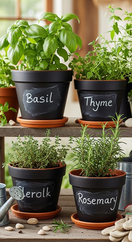 Chalkboard paint turns terracotta pots into functional and creative decor. Paint the pots with chalkboard paint, and then label them with chalk or chalk markers. This is especially useful for herb gardens where you can label each plant.