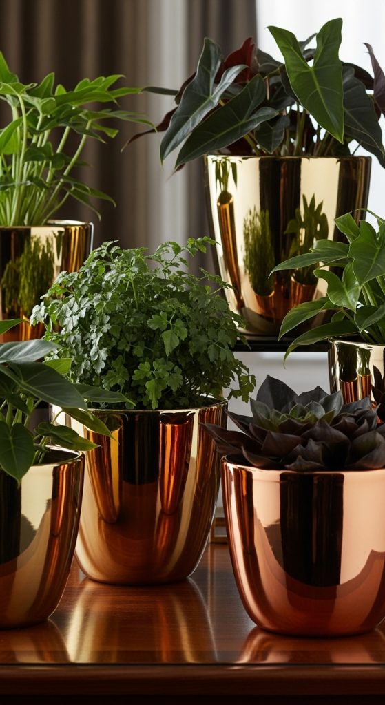 Metallic terracotta pots work well in chic living rooms, modern dining areas, or elegant outdoor spaces. The reflective quality of metallic paint enhances light and creates a luxurious feel. Pair them with dark green foliage plants for a stunning contrast.