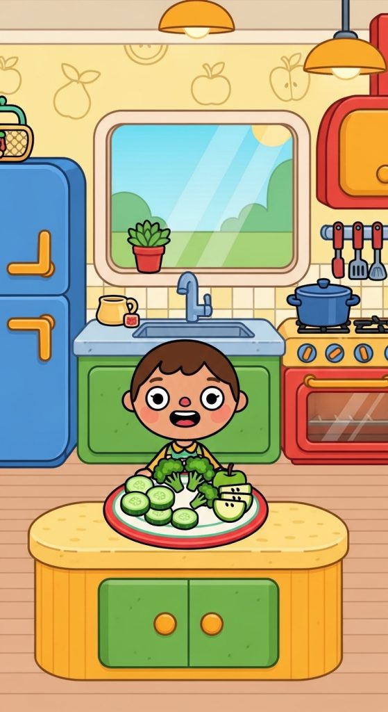 Players can design theme-based meals within the game. For example, they can prepare an all-green dinner using cucumbers, broccoli, and green apples. Or they can try a breakfast theme with eggs, toast, and juice. Creating themes adds structure to the game and encourages problem-solving as kids decide which ingredients fit the idea.