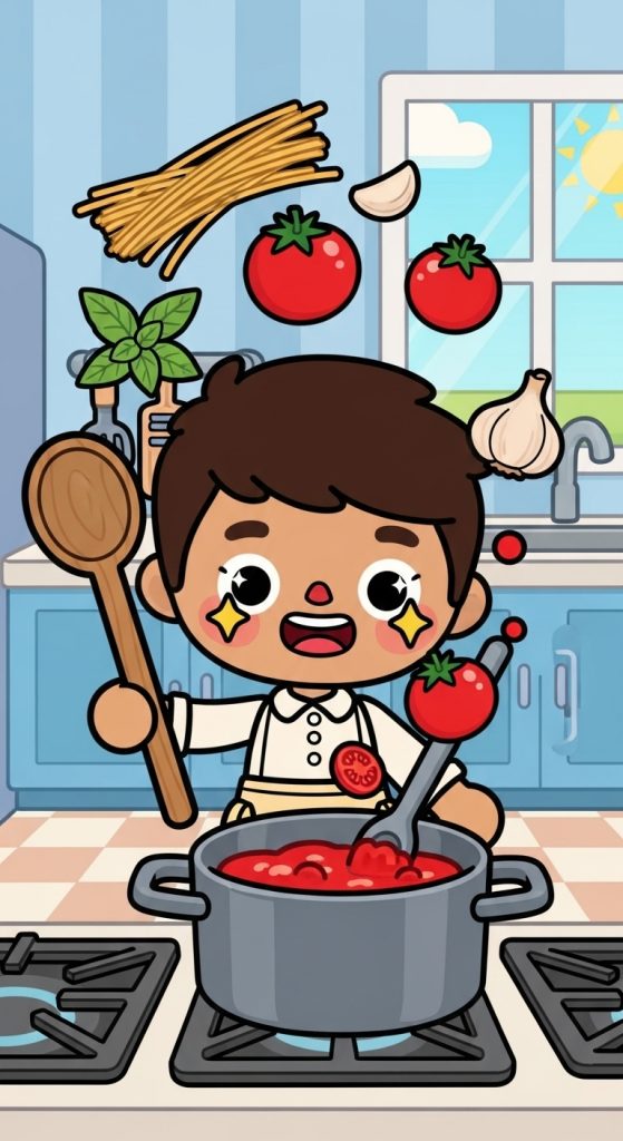 Another engaging idea is to use the Toca Kitchen app as inspiration to recreate family recipes. A child can choose to cook spaghetti in the game, then later help prepare spaghetti in real life under adult supervision.