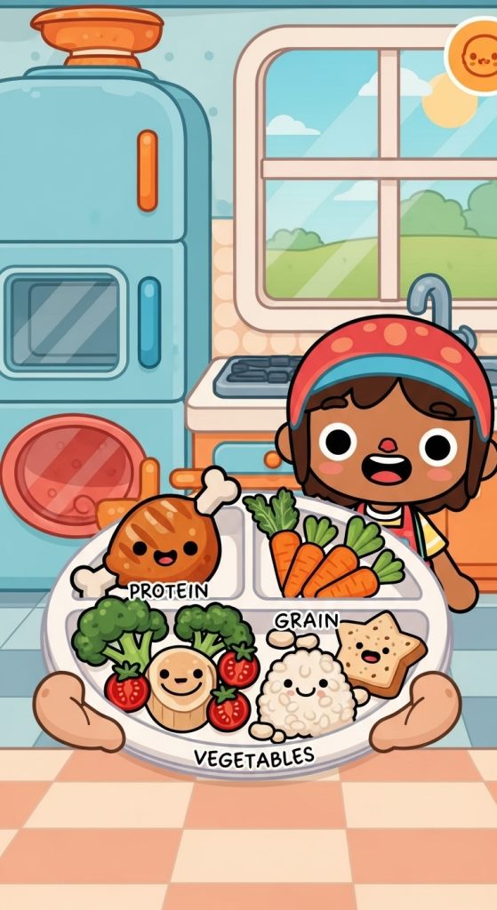 Kids can explore making balanced plates in the game, including protein, vegetables, and grains. They can compare what happens when they serve only sweets versus when they create balanced meals. This can start positive conversations about healthy eating in a playful and non-judgmental way.