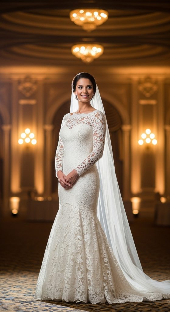 This style often extends into illusion backs or long sleeves for extra glamour. The combination of transparency and embellishment makes this type of mermaid gown ideal for brides seeking a balance of modesty and allure.