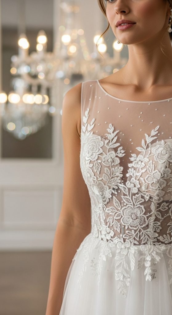 For brides who want coverage without sacrificing style, the illusion neckline mermaid gown is a wonderful choice. Featuring sheer fabrics with embroidered or beaded details, the illusion neckline creates the appearance of a strapless dress with added support.