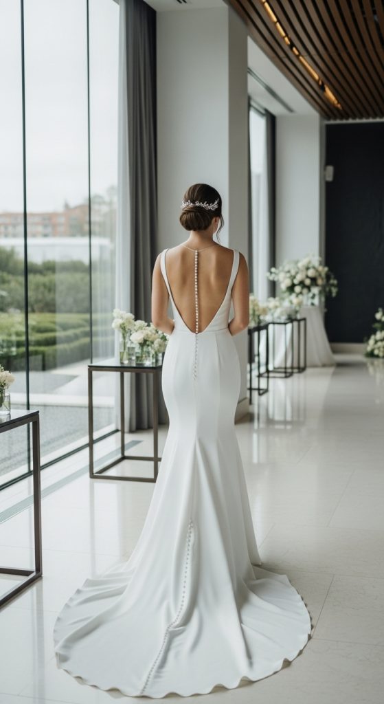 The drama of the backless design pairs beautifully with minimalist fabrics such as satin or crepe, allowing the silhouette to take center stage. This gown is ideal for modern brides who want to turn heads with a sleek and daring look.