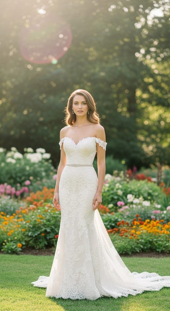 The off the shoulder mermaid gown adds a touch of romance and sophistication. It allows brides to highlight their neckline and collarbones while maintaining a structured silhouette. The fitted bodice emphasizes the waist and hips, while the off the shoulder sleeves provide a graceful detail.
