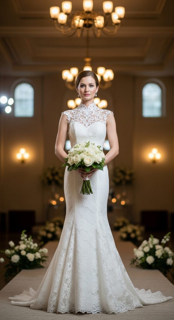 The high neck mermaid gown is elegant and modest, yet still dramatic. With fabric that covers the chest and neckline, this design creates a regal appearance while the fitted silhouette ensures it remains glamorous.