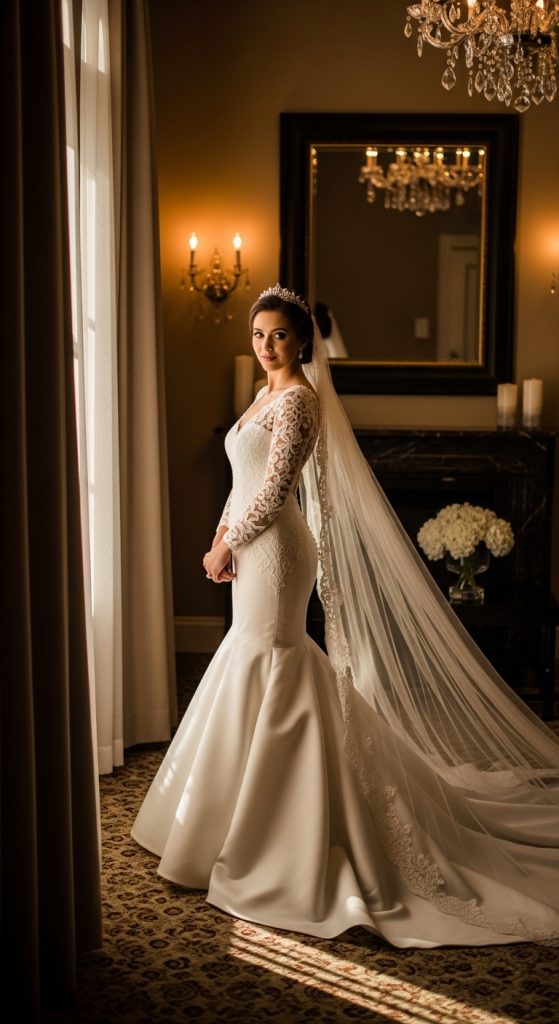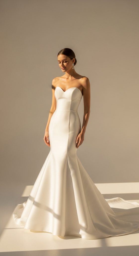 This style is perfect for modern brides who prefer understated elegance. Paired with statement jewelry or a dramatic veil, a satin mermaid dress becomes both chic and timeless.