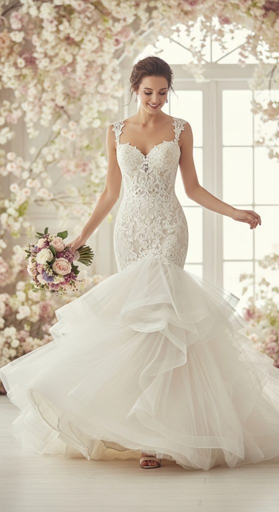 Mermaid dresses are designed to hug the body from the chest to the mid thigh or knees, then flare out gracefully toward the hem. This design emphasizes an hourglass figure and creates a striking, elegant look. With countless variations in fabrics, details, and necklines, the mermaid gown can suit a wide range of bridal styles from classic and romantic to modern and daring.