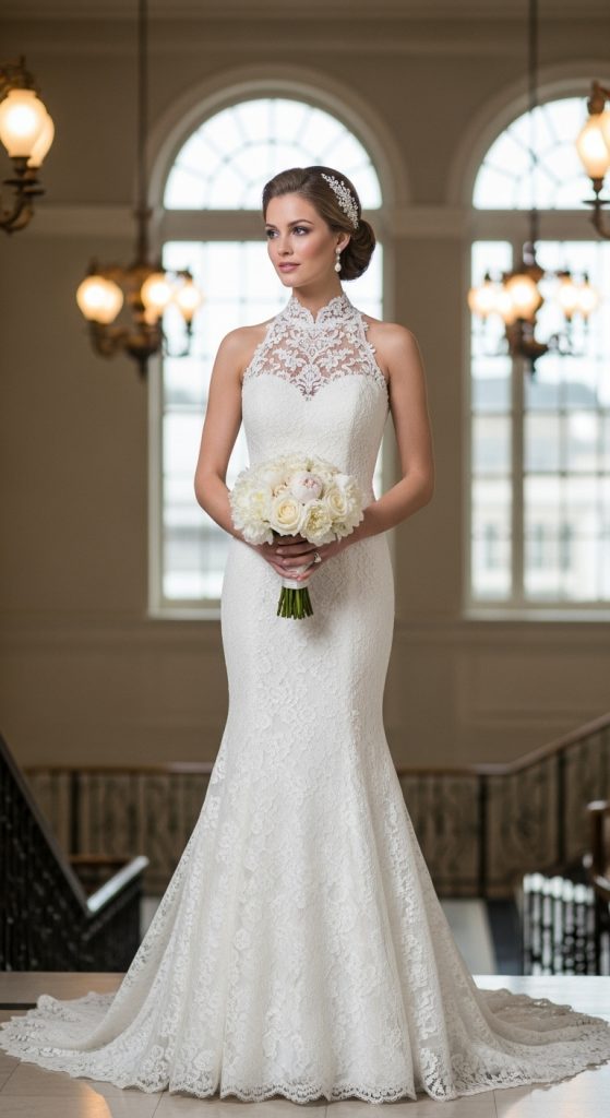 High neck mermaid dresses often feature lace overlays, intricate embroidery, or illusion details for added beauty. This gown is perfect for brides who want to combine sophistication with the boldness of a mermaid style.