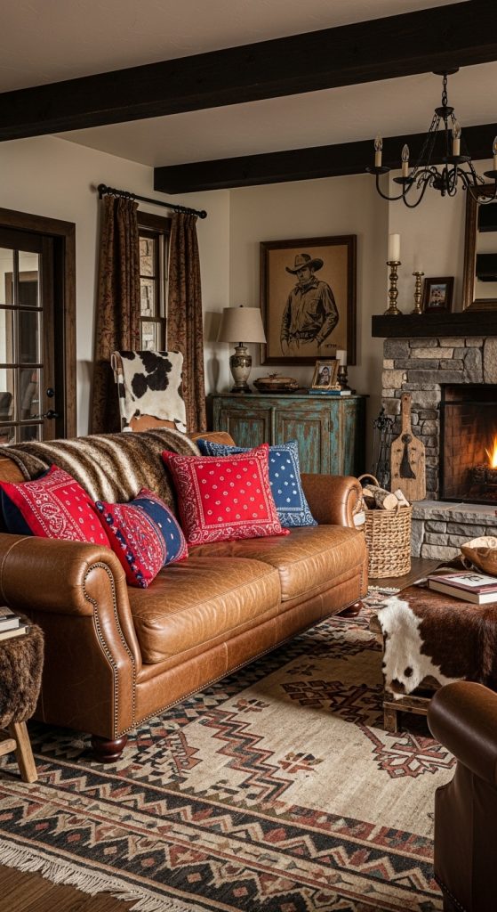 Bandanas are an affordable and colorful way to incorporate Western patterns into your home. Sew two bandanas together, leaving one side open to insert a pillow form, then stitch it closed. The result is a vibrant pillow with classic Western charm.