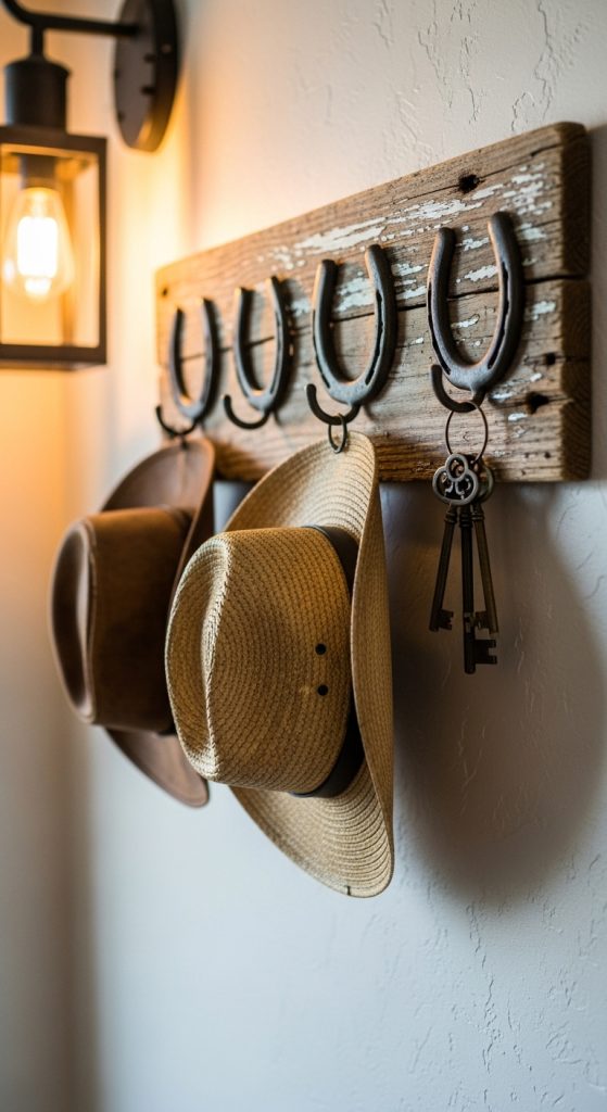 Functional items can also serve as decor. With some DIY creativity, you can build wall hooks or racks inspired by Western design. Start with a reclaimed wood plank and attach hooks made from metal, horseshoes, or even old belt buckles.